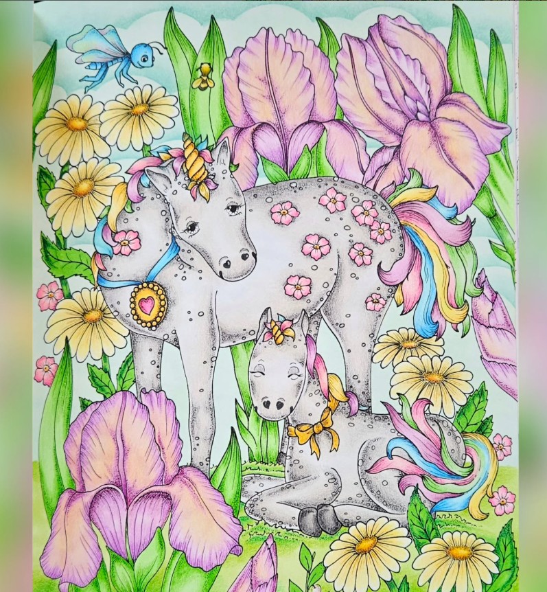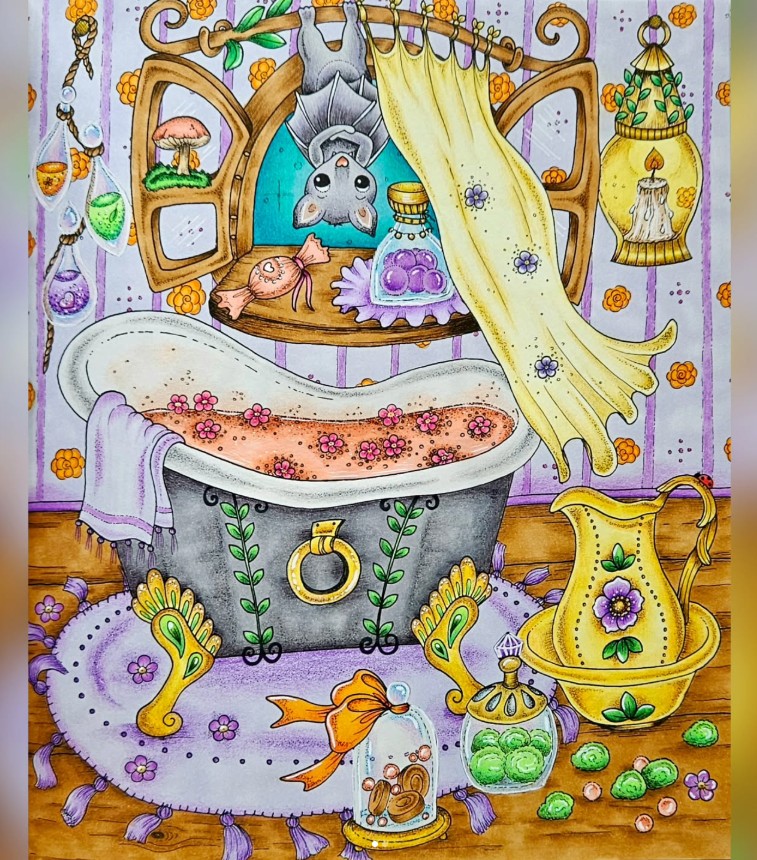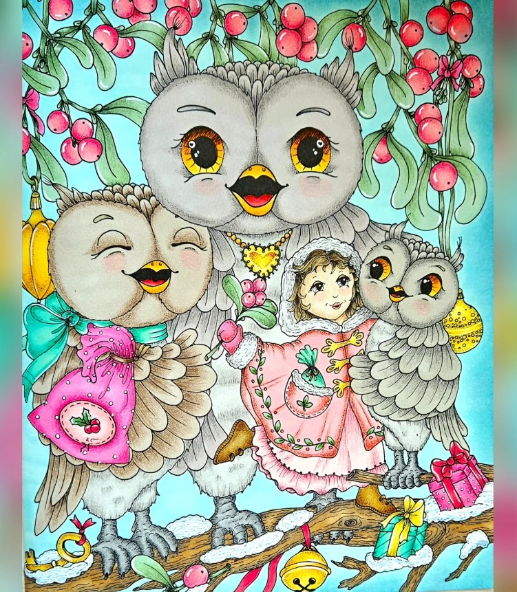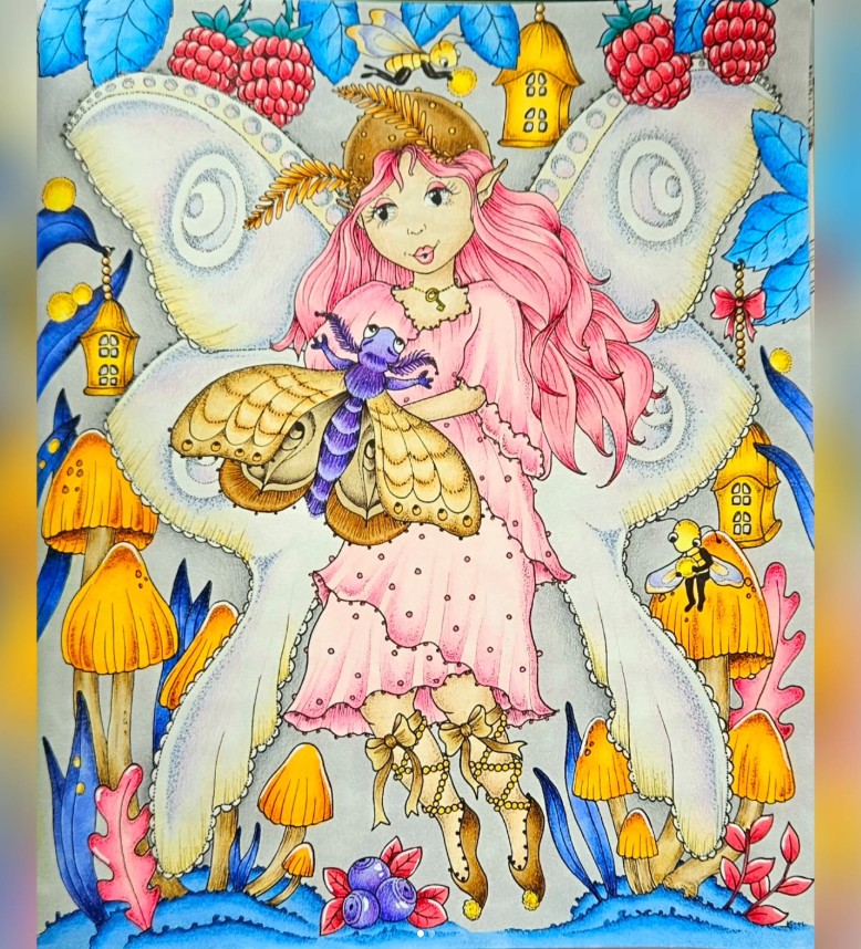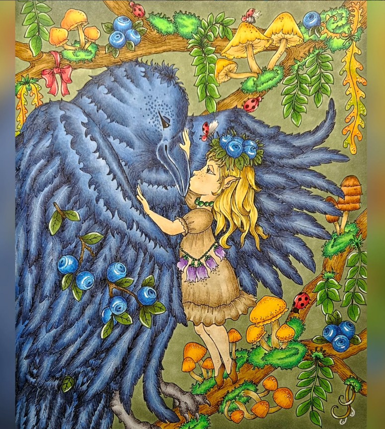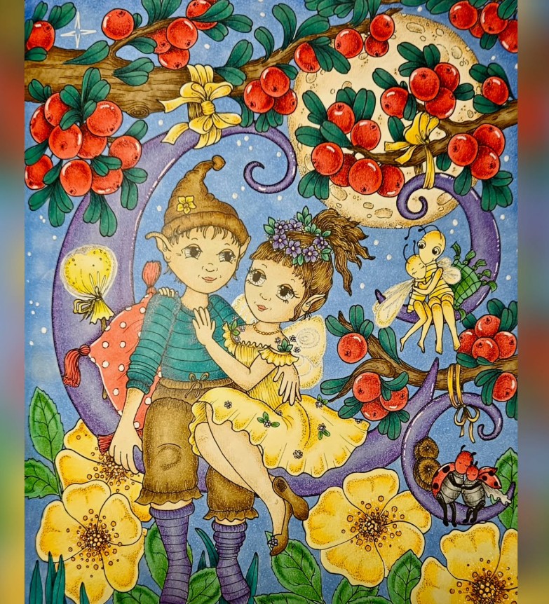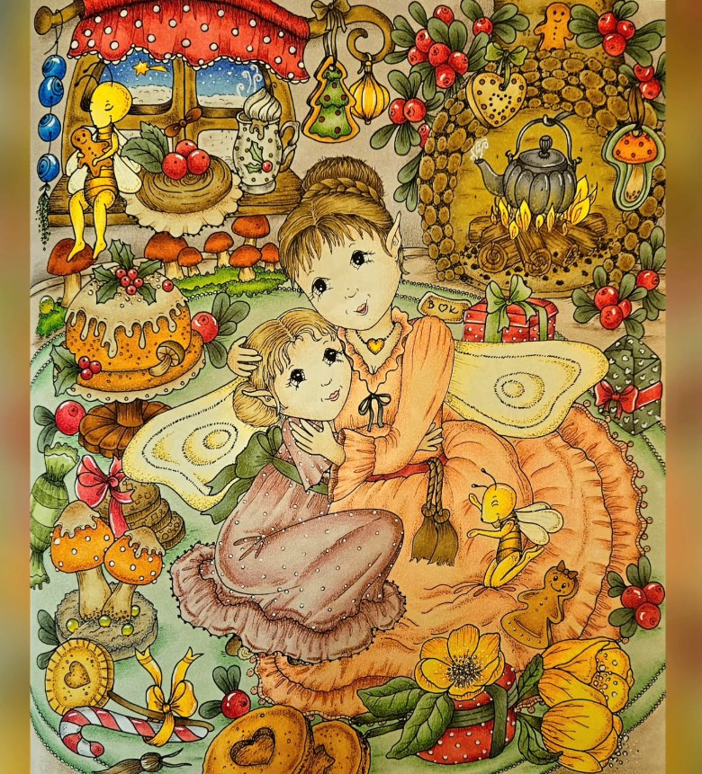 A lovely Czech adult colouring book hides a lot of original handmade illustrations inside which are connected by a thin and glittering thread of a tender story.. The main pictures to be coloured in are just on one side so you can use colour pencils and blend them happily as well as felt tip pens, liners or paints. You don´t have to worry about soaking through on the other side.. There is the main picture on one side and on the other side a small space is left decorated with little drawings where you can write: With what, When and Who painted the picture.. it also provides enough space for writing a short story or something like a story diary..i.e. What came on your mind while painting and where it ”took” you.