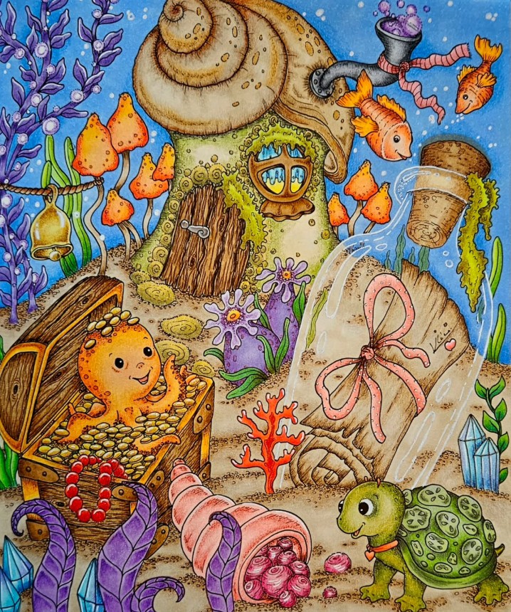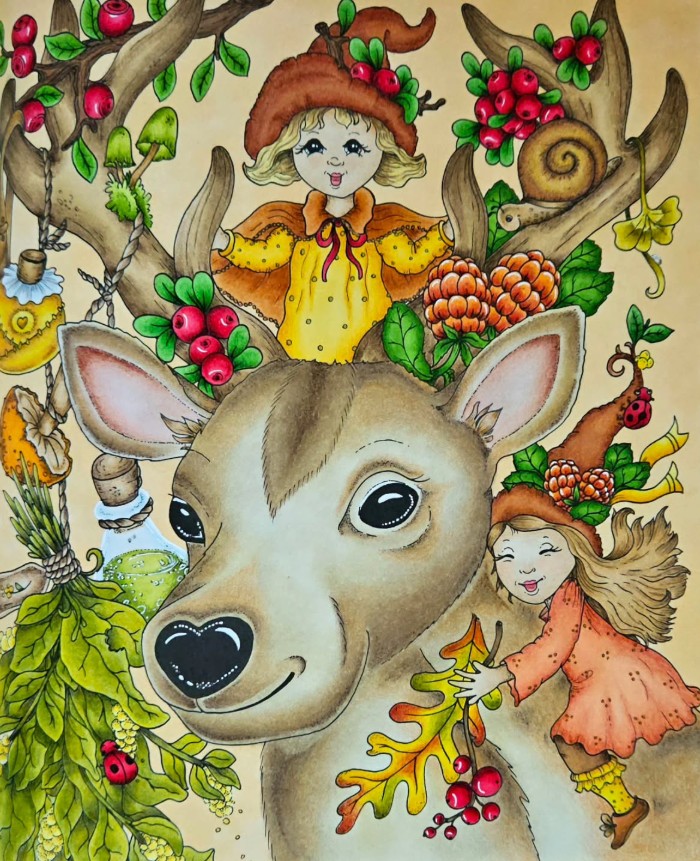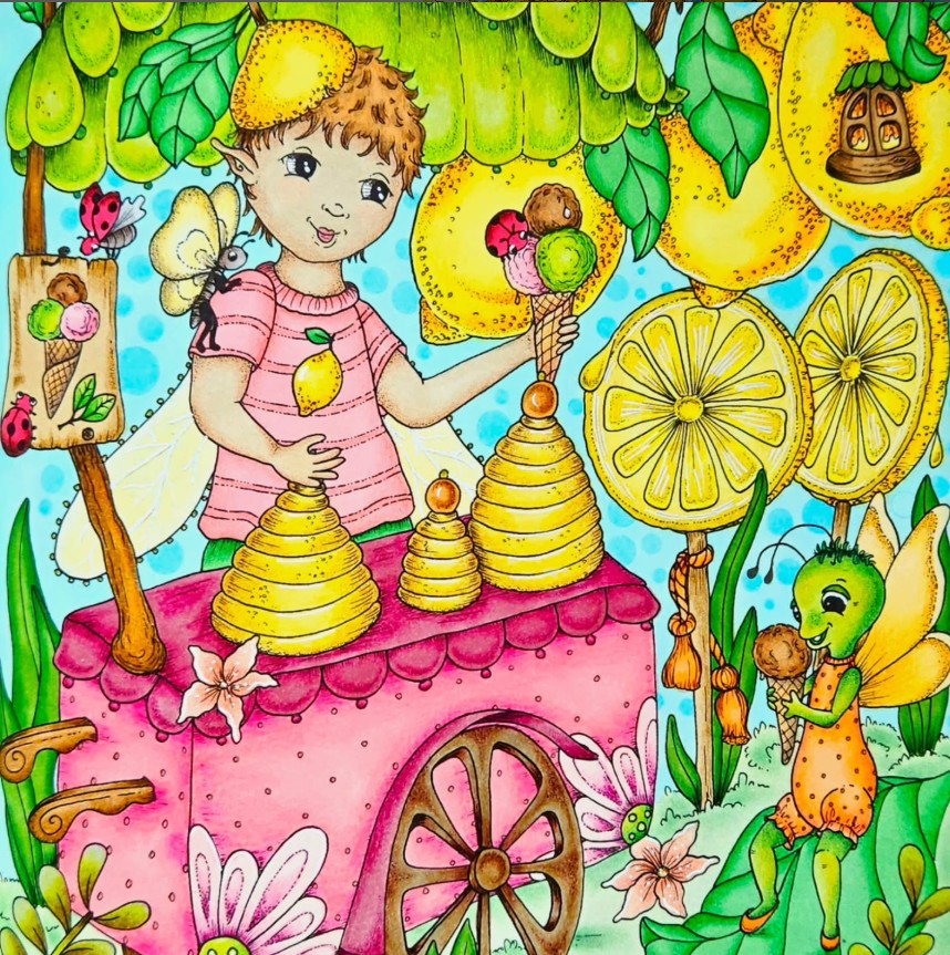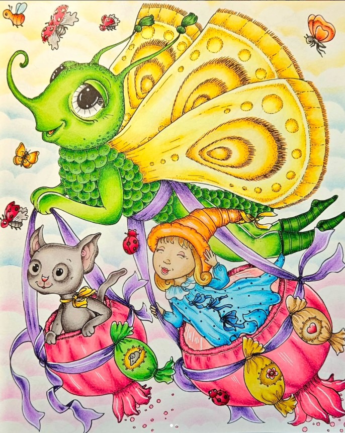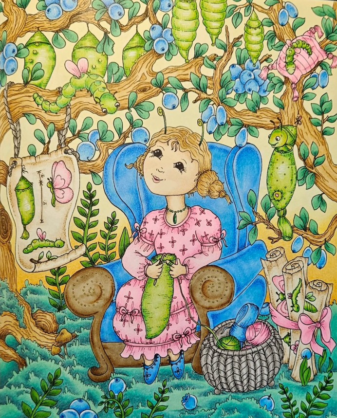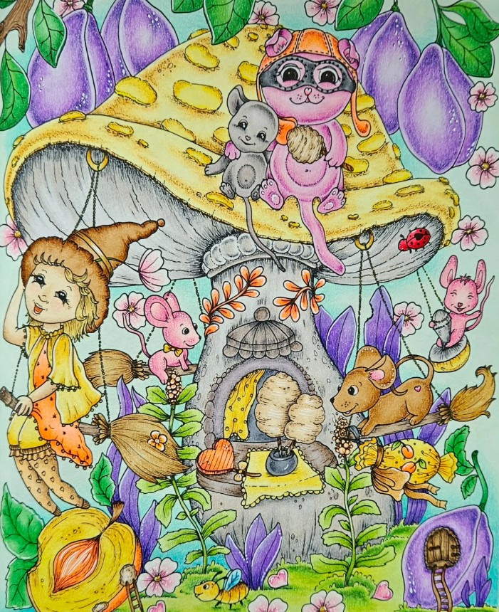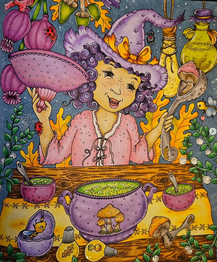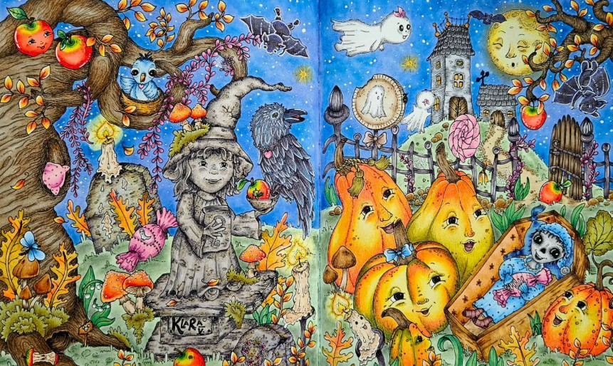 A lovely Czech adult colouring book hides a lot of original handmade illustrations inside which are connected by a thin and glittering thread of a tender story. The main pictures to be coloured in are just on one side so you can use colour pencils and blend them happily as well as felt tip pens, liners or paints. You don´t have to worry about soaking through on the other side.. There is the main picture on one side and on the other side a small space is left decorated with little drawings where you can write: With what, When and Who painted the picture.. it also provides enough space for writing a short story or something like a story diary..i.e. What came on your mind while painting and where it ”took” you.