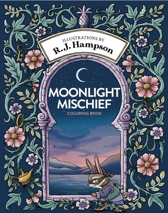 Immerse yourself in the whimsical world of ’Moonlight Mischief’. This enchanting book by illustrator R.J. Hampson features mystical creatures and fantastical scenes, all set against the backdrop of a glowing moonlit sky. Each page offers a new midnight adventure as you add your own creativity to these magical illustrations.