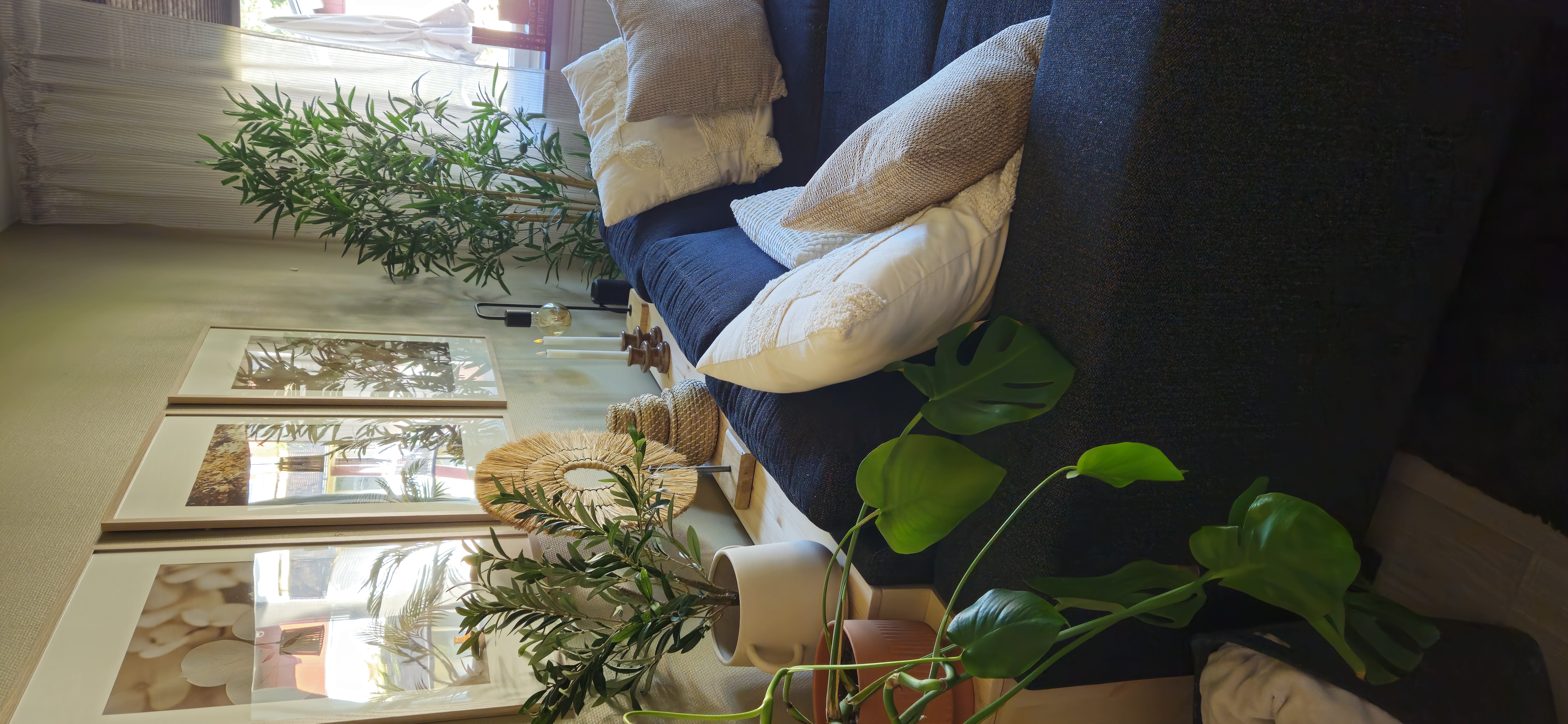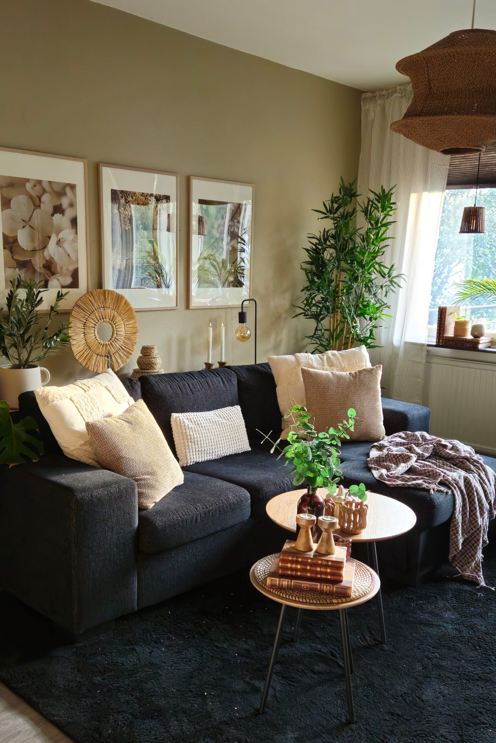 Jag bytte även ut hyllor och ramar/posters ovanför soffan, från svart till ljust trä och ljusare motiv